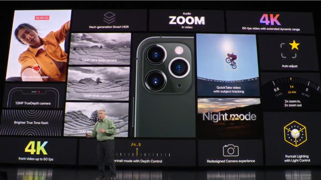 Pour l’hardware, annonce du nouveau processeur made in Apple, le A13. Il s’annonce comme le meilleur CPU et le meilleur GPU du marché des smartphones à ce jour, bien devant le Snapdragon 855. Des performances fortement améliorées et une consommation revue à la baisse, ce qui permet d’annoncer une heure de plus d’autonomie comparé au XR qui était déjà un monstre d’autonomie (pour un iPhone ^^).